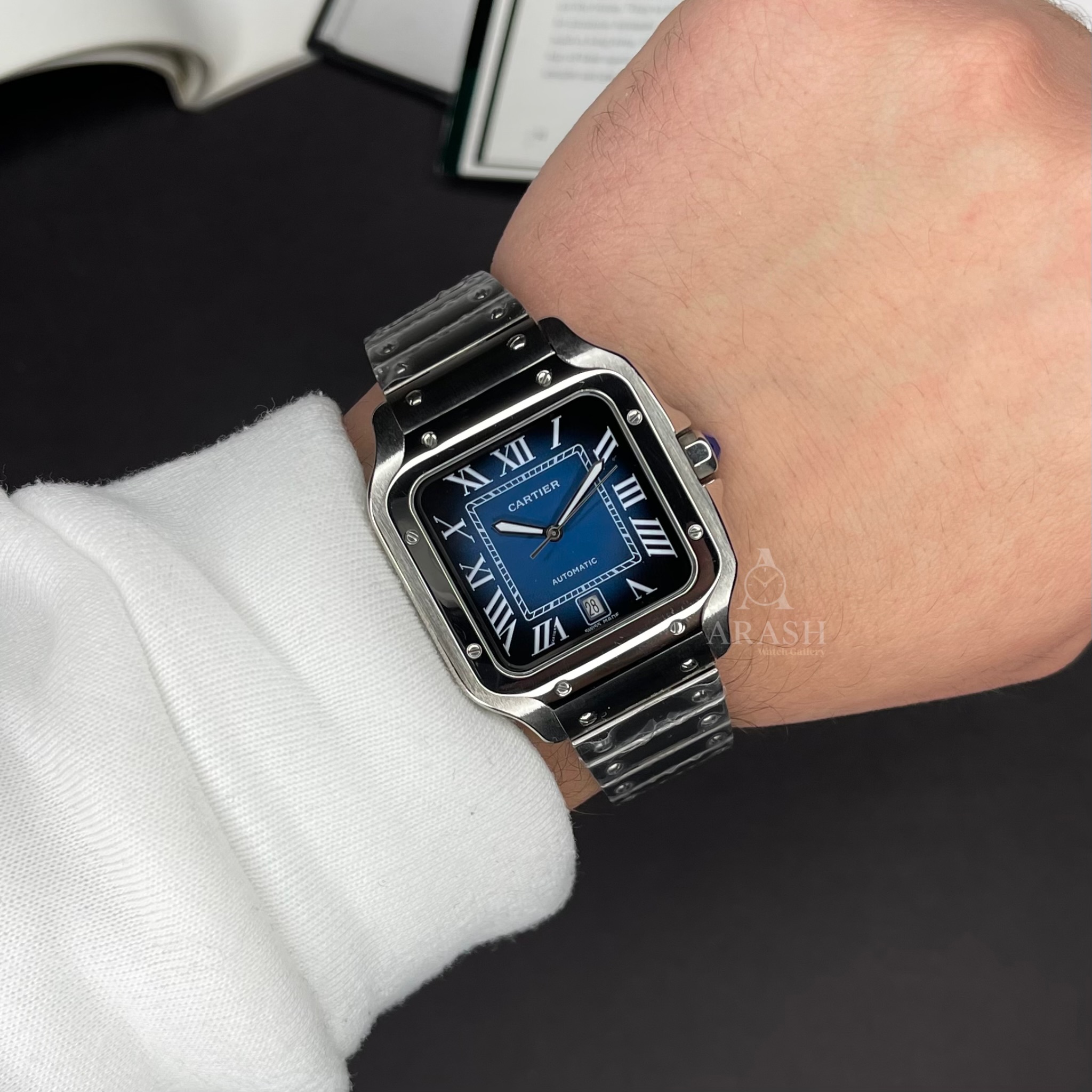 کارتیه د سانتوس اتومات تمام استیل با صفحه جذاب سرمه ایی برای آقایون خاص پسند و شیکپوش